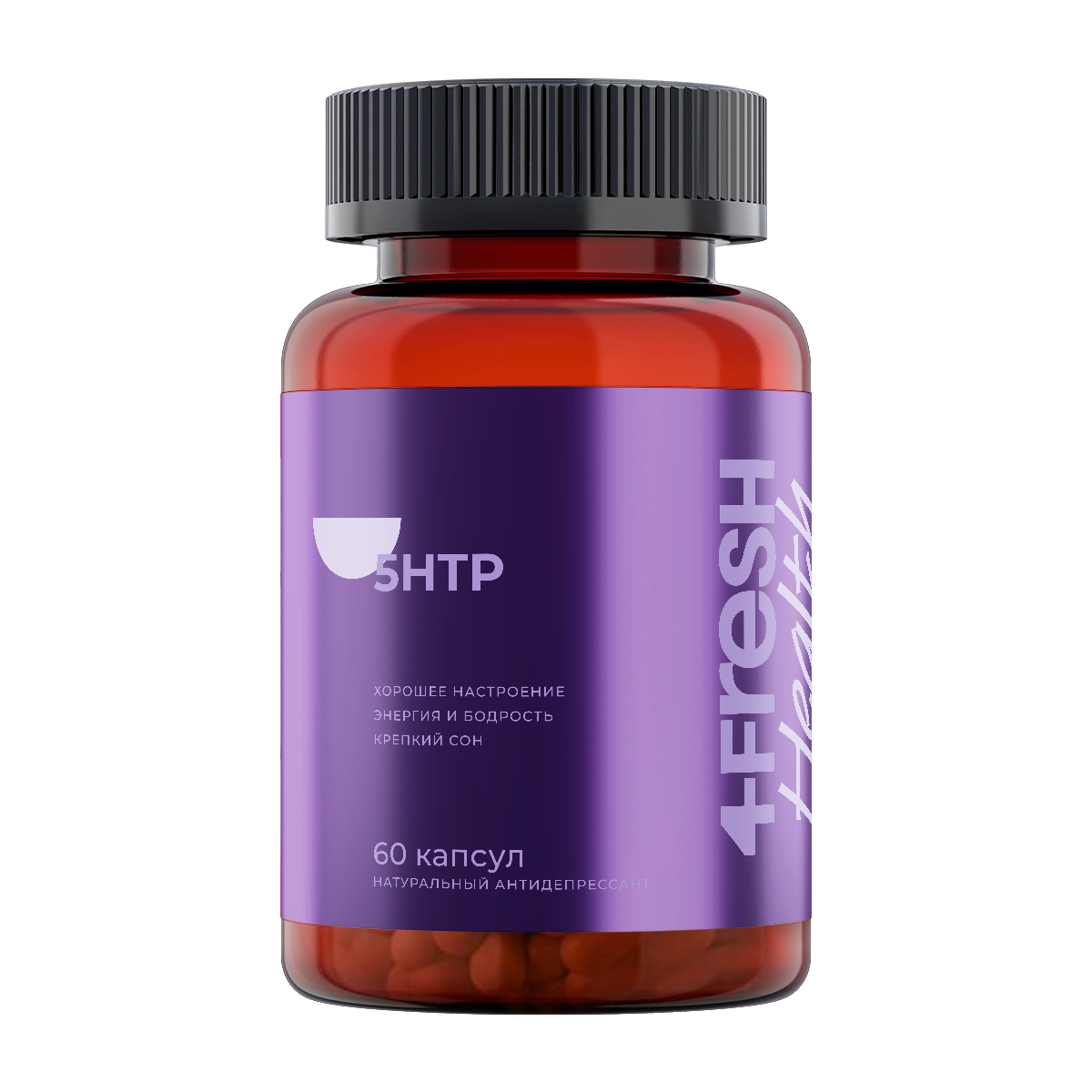 5-Гидрокситриптофан от 4FRESH HEALTH — это аминокислота, которая участвует в образовании серотонина и триптофана. Они поддерживают работу нервной системы: нормализуют настроение и биоритмы, помогают справиться со стрессом, способствуют повышению работоспособности и улучшению памяти, ускоряют адаптацию при смене часовых поясов. 5-HTP называют натуральным антидепрессантом, который не вызывает привыкания и имеет мягкое действие, благодаря естественному для человека составу. Витамин B6 в комплексе улучшает выработку серотонина. Полезные свойства: Нормализует настроение — серотонин вызывает ощущения расслабленности и спокойствия, снижает уровень тревожности, что помогает улучшить эмоциональный фон; Улучшает сон — 5 HTP преобразуется в организме в серотонин, а он, в свою очередь, может преобразоваться в гормон мелатонин – именно он играет важную роль в регулировании режима сна и делает его более здоровым и качественным; Регулирует аппетит — за счет выработки серотонина и приеме 5HTP быстрее возникает насыщение – то есть быстрее приходит насыщение и вы получаете меньше калорий.
